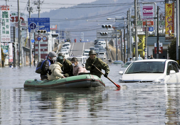 | ▲ 강진 발생 사흘째인 13일 미야기현 이시노마키에서 주민들이 자위대 보트를 타고 대피하고 있다.(이시노마키(일본)=AP/뉴시스) | ||