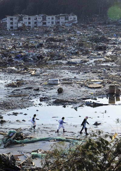 | ▲ 12일 일본 미야기현 미나미산리쿠 피해지역 주민들이 진흙탕이 된 마을을 통과해 이동하고 있다. (미야기현(일본)=뉴시스) | ||