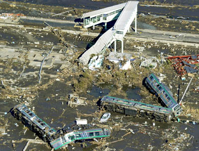 | ▲ 12일 일본 후쿠시마현 신치 시내에 쓰나미에 휩쓸린 열차의 객차들이 나뒹굴고 있다.(신치(일본)=신화/뉴시스) | ||