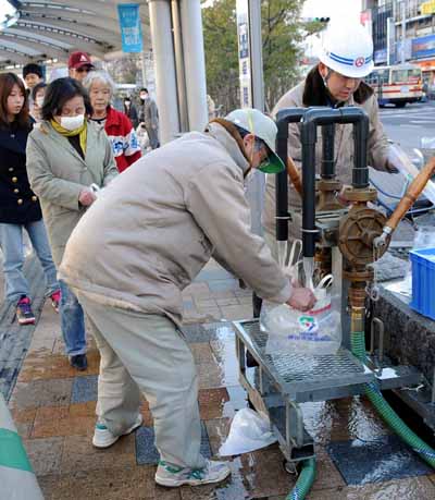 | ▲ 12일 오후 일본 후쿠시마현 코리야마 역 앞에서 지진으로 인해 수도가 끊기자 현 관계자들이 시민들에게 먹을 식수를 공급하고 있다.(후쿠시마 현(일본)=뉴시스) | ||