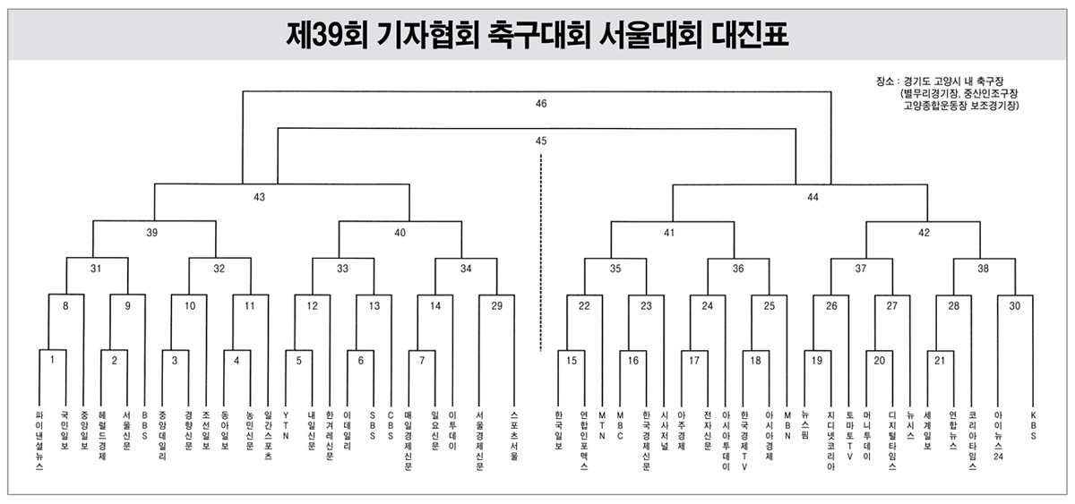 4강전부터 대표이사 5분 이상 참가시 0.5점 추가제39회 한국기자협회 축구대회 서울대회 대진 추첨이 15일 오전 서울 중구 태평로 한국프레스센터 13층 기협 회의실에서 열렸다. 이날 대진 추첨에는 서울 소재 46개 회원사가 참여했다.