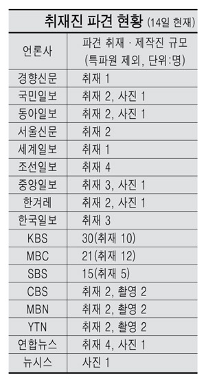 국민일보와 한겨레는 취재기자 2명·사진기자 1명, 서울신문은 취재기자 2명, 세계일보는 취재기자 1명을 보냈다.