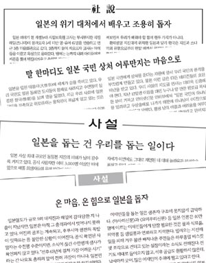 한국일보는 “일본을 돕는 건 우리를 돕는 것이다”(14일자·이하 사설 제목), 조선일보는 “말 한마디도 일본 국민 상처 어루만지는 마음으로”(14일자), 세계일보는 “일본은 힘내고, 한국은 돕고 배우고”(15일자), 한겨레는 “온 마음, 온 힘으로 일본을 돕자”(15일자), 동아일보는 “일본의 위기 대처에서 배우고 조용히 돕자”(15일자)고 각각 썼다.
