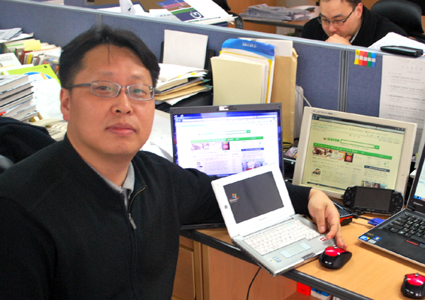 기사를 쓸 때면 그의 책상은 늘 전쟁터를 방불케 한다. 노트북에 모니터 한 대를 더 붙여 듀얼 모니터로 만들어 놓고, 또 다른 노트북 한 대는 예비용으로 준비해 놓는다. 여기에 한눈에 보기에도 작아 보이는 미니 노트북도 비치한다. 이것도 모자라 일명 울트라모바일 PC(UMPC)까지….