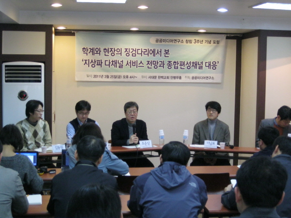 공공미디어연구소 창립 3주년을 맞아 25일 서울 서대문 한백교회 안병무홀에서 열린 포럼 ‘지상파 다채널 서비스 전망과 종합편성 대응’에서 김동원 공공미디어연구소 연구1팀장은 “종편이 생존전략 차원에서 철저한 슬림화, 인건비 절감 등 노동유연화 방식을 관철할 것”이라며 장기적 대응방안으로서 종편 내외의 방송 노동자와 기존 지상파 중심의 노조의 연대 문제를 지적했다.