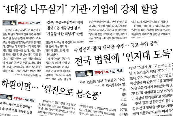 경 향신문은 이 가운데 4건의 제보에 대해 사실확인을 거쳐 1면에 내보냈다. ‘‘4대강 나무심기’ 기관·기업에 강제 할당(5일)’, ‘하필이면…‘원전으로 봄소풍’가는 초등학교들(2일)’, ‘전국 법원에 ‘인지대 도둑’(1일)’, ‘사랑의 열매’ 모금회 웬 안보교육 워크숍(3월30일)’ 등이다.
