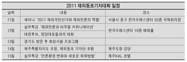 2011년 재외동포기자대회가 오는 10일부터 16일까지 서울과 제주도 등지에서 7일간의 일정으로 열린다.