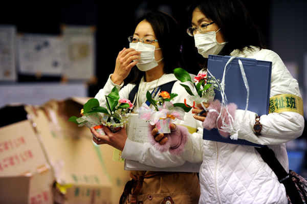 ▲ 지난달 25일 일본 사이타마현 사이타마에서 대피소로 사용 중인 한 체육관에 자원봉사자들이 주민들에게 나눠줄 꽃을 들고 들어서고 있다. (사이타마(일본)=신화/뉴시스) |
