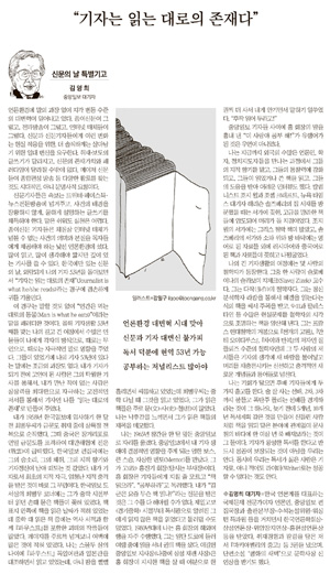 김 대기자는 이날 칼럼 ‘기자는 읽는 대로의 존재다’에서 “신문기자들은 속보는 트위터․페이스북․뉴스전문방송에 넘겨주고, 사건의 배경을 장황하지 않게, 쿨하게 설명하는 글쓰기를 체득해야 한다”며 “종이신문 기자들은 체질상 인터넷 매체가 넘볼 수 없는 사건의 의미와 본질을 독자들에게 제공해야 하는 낯선 언론환경에 섰다”고 말했다.