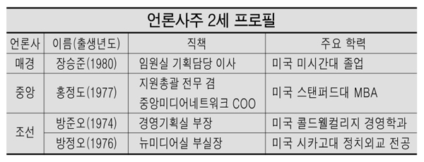 두 신문 모두 사주 아들들이 미국 유학을 다녀왔고, 20대 후반 회사에 들어와 30대 초·중반의 나이에 그룹 전반을 관리하는 핵심 부서에서 일하고 있다. 중앙의 경우 정도씨가 전무로 승진하면서 전면에 등장했고, 조선은 사주 아들들이 차장, 부장 등 중간 관리직에 있으면서 경영 수업을 받고 있다.