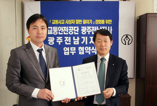 광주·전남기자협회(협회장 박원우·사진 왼쪽)와 교통안전공단 광주전남지사(지사장 민점기)가 지난 6일 ‘업무협약을 체결하고 ‘교통사고 사상자 절반줄이기 운동’에 상호 협력하기로 했다.