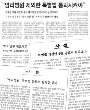 한라일보는 7일 사설 ‘‘영리병원’ 특별법 볼모로 삼아선 안돼’에서 “제주특별법이 4월 국회에서 처리되지 않을 경우 국책사업이 뿌리째 흔들릴 수 있다는 것은 불 보듯 뻔한 일”이라면서 “제주도를 특별자치도로 육성할 의지가 있다면 정부 부처와 여야는 영리병원 등을 볼모로 삼지 말고 제주 지역의 시각에서 문제를 풀어야 할 것”이라고 주장했다.