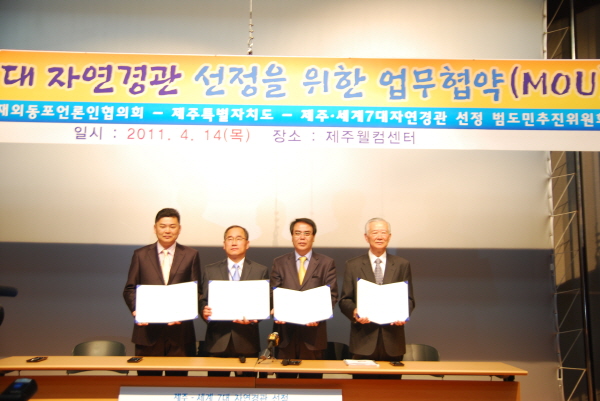 ▲ 제주도와 재외언론인협의회, 한국기자협회, 제주 세계7대자연경관 선정 범도민추진위원회는 14일 오전 제주 웰컴 센터에서 제주 세계 7대자연경관 선정을 위한 홍보협력 협약을 체결했다. 왼쪽부터 위영석 제주도기자협회장, 이종국 재외동포언론인협의회 회장, 김부일 제주도 환경경제부지사, 부만근 제주 세계7대자연경관 범도민추진위원장. |