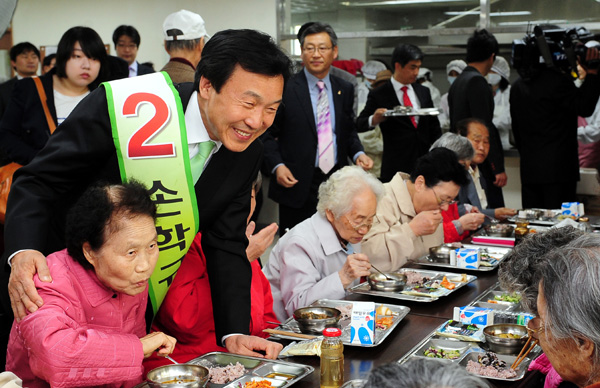 | ▲ 21일 오전 4·27 재보궐선거 성남 분당 을에 출마한 손학규 민주당 후보가 경기 성남 분당 한솔종합복지관에서 어르신들의 식사모습을 살펴보고 있다. (뉴시스=경기신문 제공) | ||