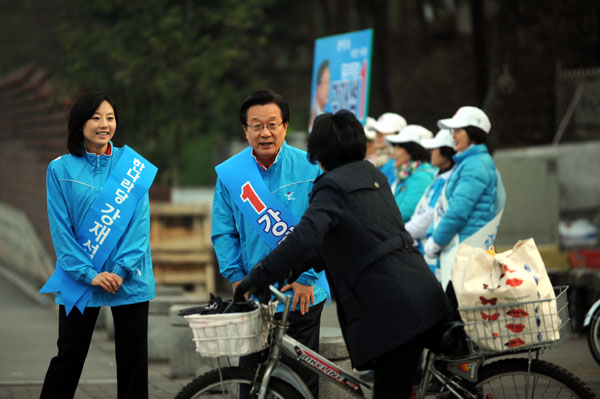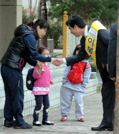 | ▲ 20일 오전 4·27 재보궐선거 성남 분당 을에 출마한 강재섭 한나라당 후보가 경기 성남 분당구 한솔7단지 버스정류장에서 출근하는 유권자에게 한표를 호소하고 있다. (뉴시스=강재섭 후보 사무실 제공) | ||