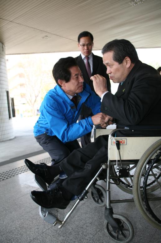 | ▲ 한나라당 엄기영 강원도지사 후보는 20일 오전 춘천 강원대학교 백령아트센터에서 열린 강원도 장애인의 날 행사에 참석, 참석자들과 악수를 하며 지지를 호소하고 있다. (뉴시스) | ||