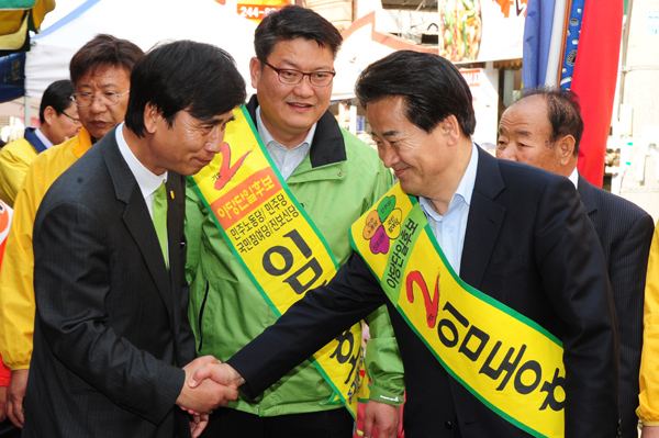 | ▲ 4·27 재보선 중반에 접어 든 20일 민주당 정동영 최고위원과 국민참여당 유시민 대표가 울산 중구 태화시장을 방문해 야권단일후보인 민주당 임동호 구청장 후보의 유세를 돕고 있다.(뉴시스) | ||