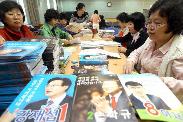 | ▲ 20일 오전 경기 성남 구미동주민센터에서 선관위 관계자들이 4·27 국회의원 보궐선거에 출마한 각 후보들의 공보물 발송작업을 하고 있다. (뉴시스) | ||