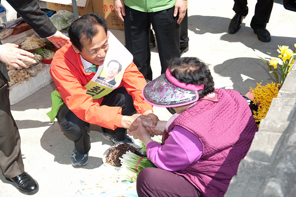 | ▲ 16일 오전 민주당 최문순 강원도지사 후보가 강원 홍천군 중앙시장에서 유권자들과 인사를 나누며 지지를 호소하고 있다. (뉴시스=최문순 후보 제공) | ||