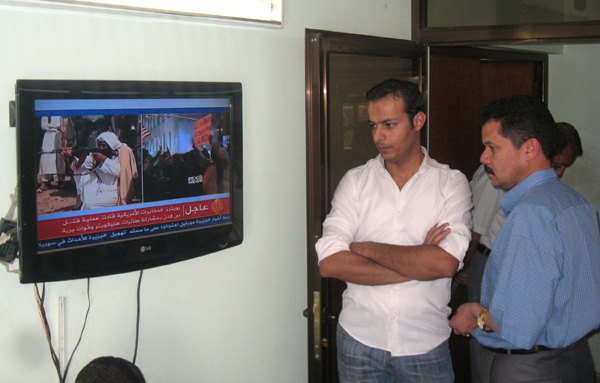 | ▲ 이라크 시민들이 2일(현지시간) 오사마 빈 라덴의 사망 소식을 알리는 뉴스를 시청하고 있다. (AP/뉴시스) | ||