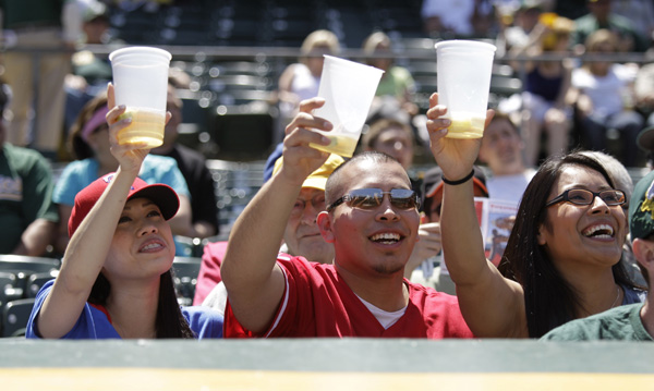 | ▲ 메이저리그 텍사스 레인저스와 오클랜드 애슬레틱스와의 경기를 관람하던 관중들이 2일(현지시간) 오사마 빈 라덴의 사망 소식이 전해지자 술잔을 들어올리며 기뻐하고 있다. (AP/뉴시스) | ||