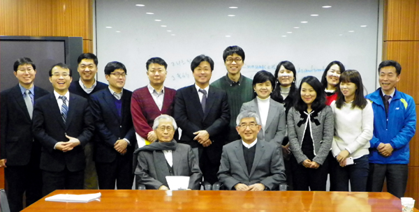 ▲ 중앙일보 학습모임인 ‘J-코기토’ 회원들이 지난 1월25일 최장집 고려대 명예교수의 강의를 들은 뒤 기념사진을 찍었다. 앞줄 왼쪽에 앉아 있는 사람이 김영희 대기자, 그 옆은 최장집 교수. (중앙일보 사보 제공) |