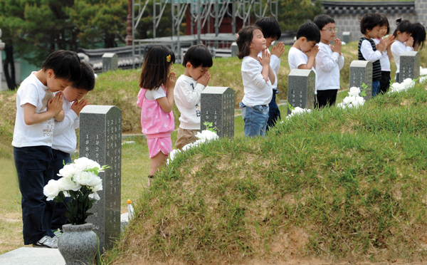 ▲ 5·18광주민주화운동 31주년 기념일을 하루 앞둔 17일 광주시 북구 운정동 국립 5·18 민주묘지에서 유치원생들이 참배하고 있다. (광남일보 제공) |