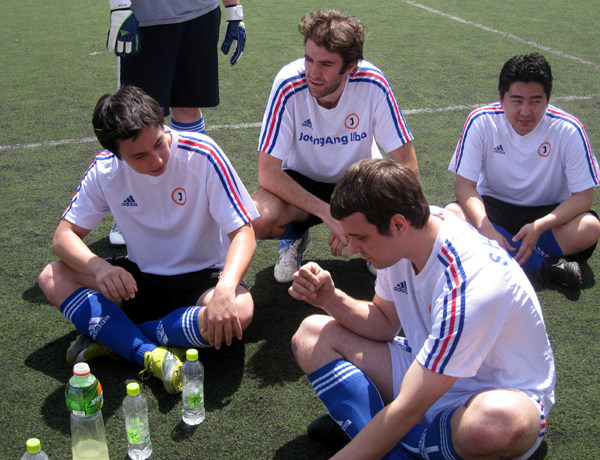 ▲ 14일 고양 별무리 구장에서 경향신문과 맞붙은 코리아중앙데일리뉴스 외국인 선수들이 하프 타임 때 작전을 교환하고 있다. |