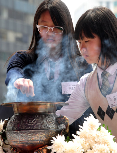 | ▲ 5·18 민주항쟁 31주년인 18일 오전 서울광장에서 열린 '31주년 5·18민주화 운동 서울기념식'에 참석한 학생들이 헌화를 하고 있다. (뉴시스) | ||