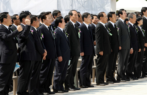 | ▲ 5·18 민중항쟁 제31주년 기념식이 열린 18일 오전 광주 북구 운정동 국립 5·18민주묘지 행사장에서 김황식 국무총리, 황우여 한나라당 대표와 손학규 민주당 대표, 강운태 광주시장, 박준영 전남지사 등 내빈들과 5월 3단체 대표들이 '임을 위한 행진곡'을 제창하고 있다. (뉴시스) | ||