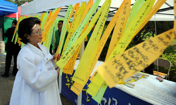 | ▲ 5·18민주화운동 31주년 기념식이 열린 18일 오전 5·18민주유공자유족회 관계자가 국립5·18민주묘지 입구에 걸린 추모의 글을 보고 있다. (뉴시스) | ||