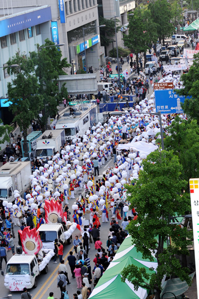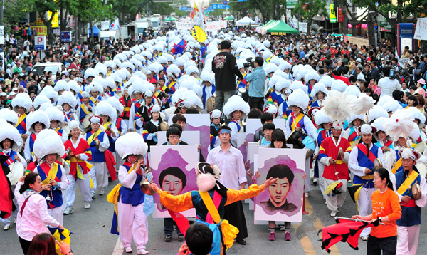 | ▲ 5·18민중항쟁 31주년 기념 전야제가 열린 17일 오후 광주 동구 금남로에서 1000여 명의 시민, 학생, 풍물패가 1980년 5월 당시를 재현하는 퍼레이드를 펼치고 있다. (뉴시스) | ||