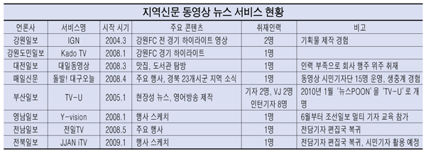 인력난에 동영상 서비스 주춤일부 신문의 경우 회사 투자가 줄어들면서 동영상 서비스가 주춤하다. 전담기자가 여러 업무를 동시에 보는 대전일보와 편집국으로 복귀한 전남일보는 다양한 볼거리 영상이 사라지고 회사 행사 위주로 콘텐츠를 채우고 있다.