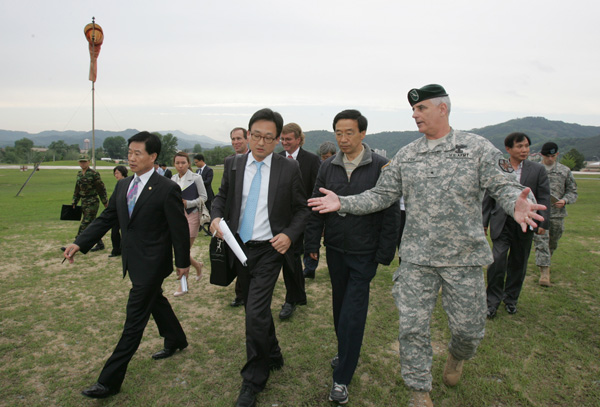 | ▲ 23일 오후 경북 칠곡군 왜관읍 캠프 캐럴 기지에서 민관합동조사단 관계자들이 미군의 안내를 받아 고엽제 매립지로 추정되는 헬기장 인근 'D구역'을 둘러보며 이야기 나누고 있다.오른쪽부터 데이비드 팍스 미8군 기지관리사령관, 한나라당 이인기 의원, 취재기자, 곽경호 칠곡군의회 의장. (뉴시스=사진공동취재단) | ||