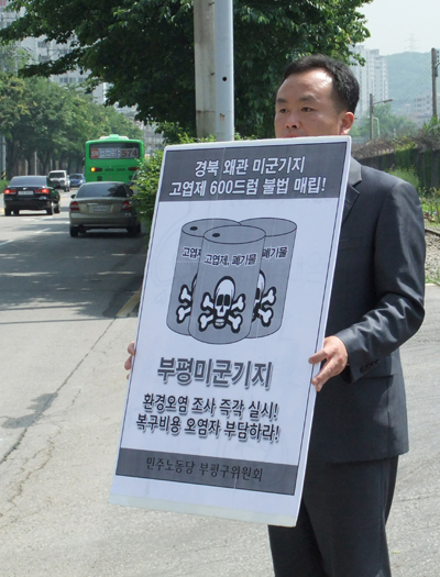 | ▲ 민주노동당 인천시당 김응호 사무처장이 23일 오후2시부터 인천 부평구에 위치한 미군부대 정문 앞에서 경북 왜관 미군기지 고엽제 매립 환경오염 조사 즉각 실시를 촉구 1인시위를 하고 있다. (뉴시스) | ||