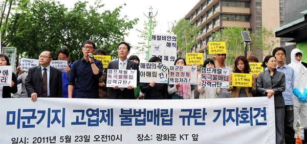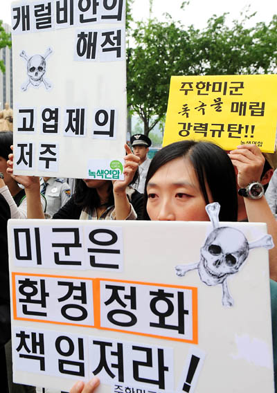 | ▲ 23일 오전 서울 종로구 광화문 KT 앞에서 녹색연합 관계자들이 '미군 캠프 캐럴 고엽제 불법매립 규탄 기자회견'을 하고 있다. (뉴시스) | ||