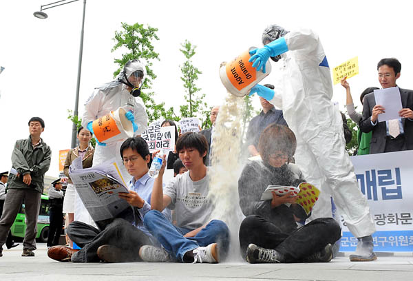 | ▲ 23일 오전 서울 종로구 광화문 KT 앞에서 열린 '미군 캠프 캐럴 고엽제 불법매립 규탄 기자회견'에서 녹색연합 관계자들이 고엽제 불법매립을 규탄하는 퍼포먼스를 하고 있다. (뉴시스) | ||