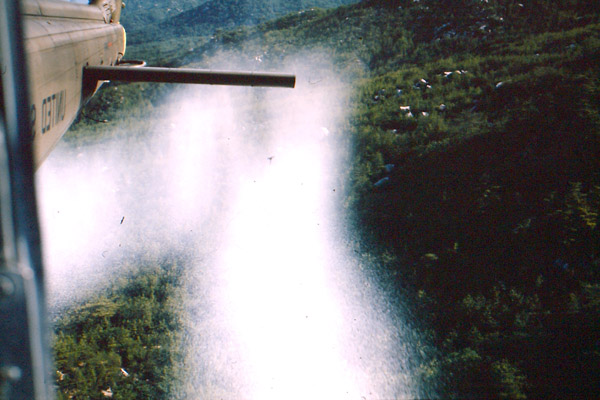 ▲ 미군 항공 6소대 헬리콥터가 춘천 북쪽 DMZ 지대에서 고엽제를 뿌리고 있다. (사진=강원도민일보, 짐 힐튼) |