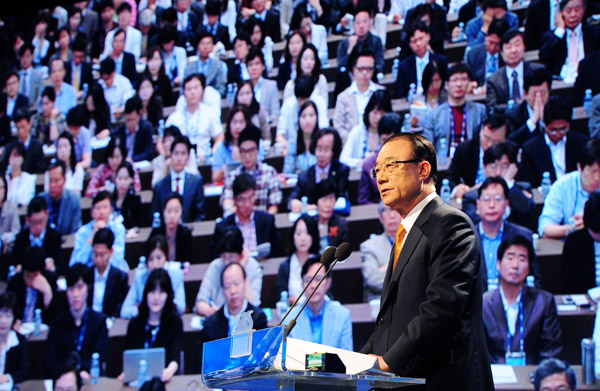 ▲ 최시중 방송통신위원장의 ‘종편 직접 광고 허용’ 발언이 파장을 일으키고 있다. 사진은 지난달 25일 오전 서울 광장동 쉐라톤 워커힐 호텔에서 열린 서울 디지털 포럼 2011에서 축사를 하는 최 위원장. (뉴시스) |