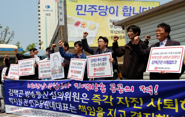언론노조는 9일 각 본부․지부․분회장에 보낸 공문을 통해 “지난 4월부터 지역방송협의회와 함께 김택곤 전 전주방송 사장의 방통심의위원 내정과 관련해 우리들의 의견과 성명서 발표, 기자회견, 민주당 앞 농성 등을 하며 반대 입장을 천명했다”며 “손학규 민주당 대표와 당시 원내대표 박지원 국회의원의 면담을 통해 김택곤 씨의 내정철회를 주장했으나 받아들여지지 않았다”고 밝혔다.