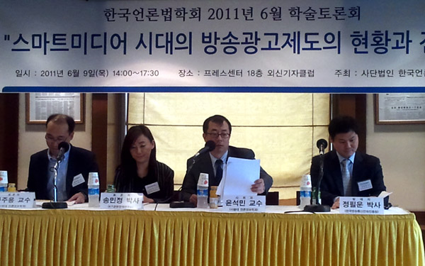▲ 9일 언론법학회 주최로 서울 중구 한국프레스센터 18층 외신기자클럽에서 열린 '스마트미디어시대 방송광고제도의 현황과 전망' 토론회에서 윤석민 서울대 교수가 발표하고 있다. |