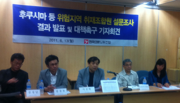 전국언론노조는 13일 서울 한국프레스센터 18층 사무실에서 기자회견을 열고 후쿠시마․체르노빌 원전 사고 지역을 취재한 10개 언론사 노조원 1백23명의 검진 결과를 조사한 결과 KBS 26명 중 8명이 염색체 변형 진단을 받았다고 밝혔다.