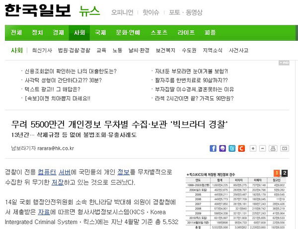 ▲ 한국일보가 15일자로 보도한 ‘무려 5500만 건 개인정보 무차별 수집․보관 ‘빅브라더 경찰’. |