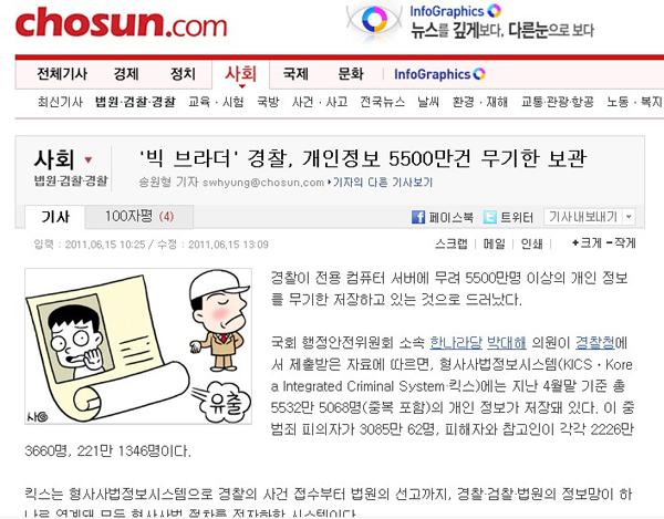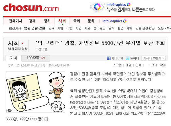▲ 조선닷컴이 15일 오전 10시25분에 보도한 ‘‘빅 브라더’ 경찰, 개인정보 5500만건 무기한 보관’. |