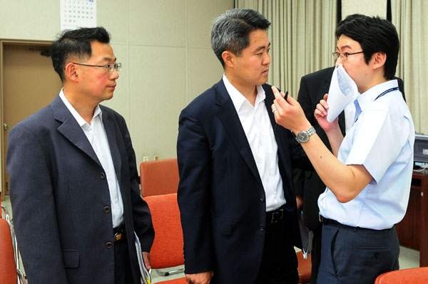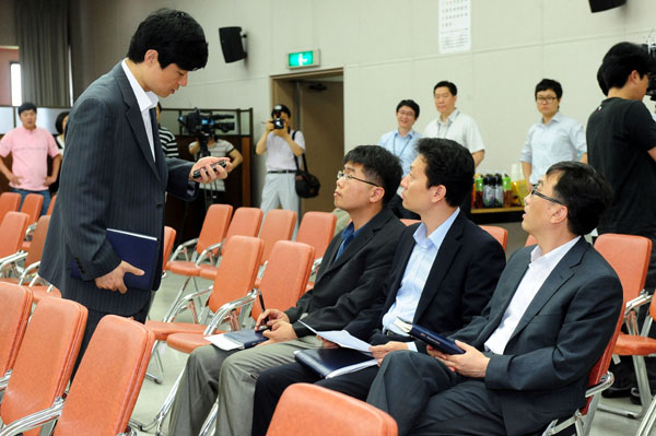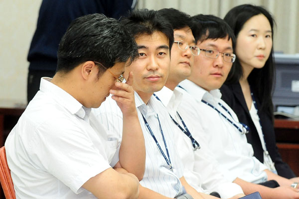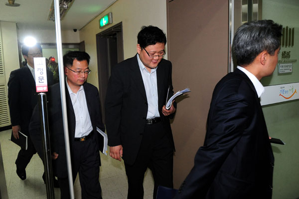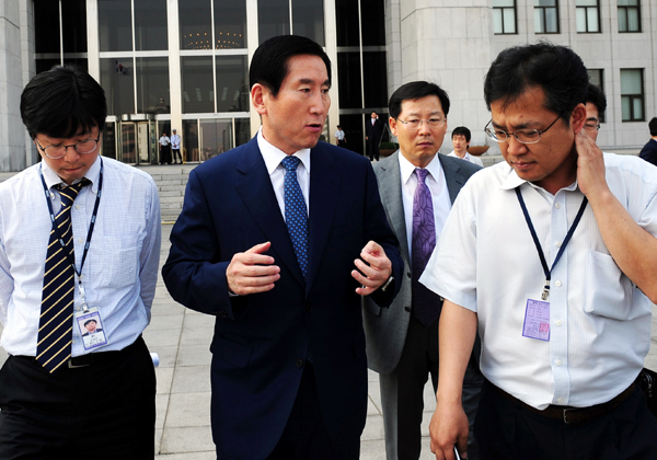 | ▲ 검·경 수사권 조정 방안을 논의하기 위해 19일 오후 서울 중앙지검 대회의실에서 열린 평검사 회의에 앞서 참석자들이 심각하게 논의하고 있다. 지난 2005년 참여정부 시절 이후 6년 만에 열린 이날 회의는 언론에 비공개로 진행됐다.(뉴시스) | ||