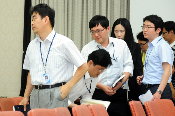 | ▲ 19일 오후 서울 중앙지검 대회의실에서 열린 평검사 회의에서 검사들이 취재진의 입장을 이유로 회의장을 나서고 있다. (뉴시스) | ||
