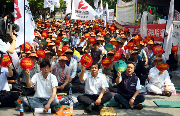 ▲ 20일 서울 여의도 산업은행 앞에서 열린 언론노조 결의대회에서 소속 조합원들이 종편의 미디어렙 광고 위탁을 요구하는 구호를 외치고 있다. (언론노조 제공) |