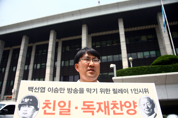 ▲ 20일 서울 여의도 KBS 본관 앞에서 비대위 소속 회원이 이승만 전 대통령·백선엽 예비역 대장 다큐 중단을 요구하는 1인시위를 벌이고 있다. (언론노조 제공) |