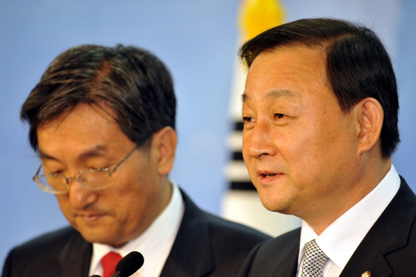 | ▲ 한나라당 이명규(오른쪽), 민주당 노영민 원내수석부대표가 22일 국회 정론관에서 KBS 수신료 인상안 여야 합의에 대해 설명하고 있다.(뉴시스) | ||
