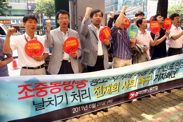 ▲ 전국언론노조 이강택 위원장 등 소속 노조원들이 28일 전재희 문방위원장 지역구인 광명시 의원 사무실 건물 앞에서 규탄 기자회견을 열고 있다. (언론노조 제공) |